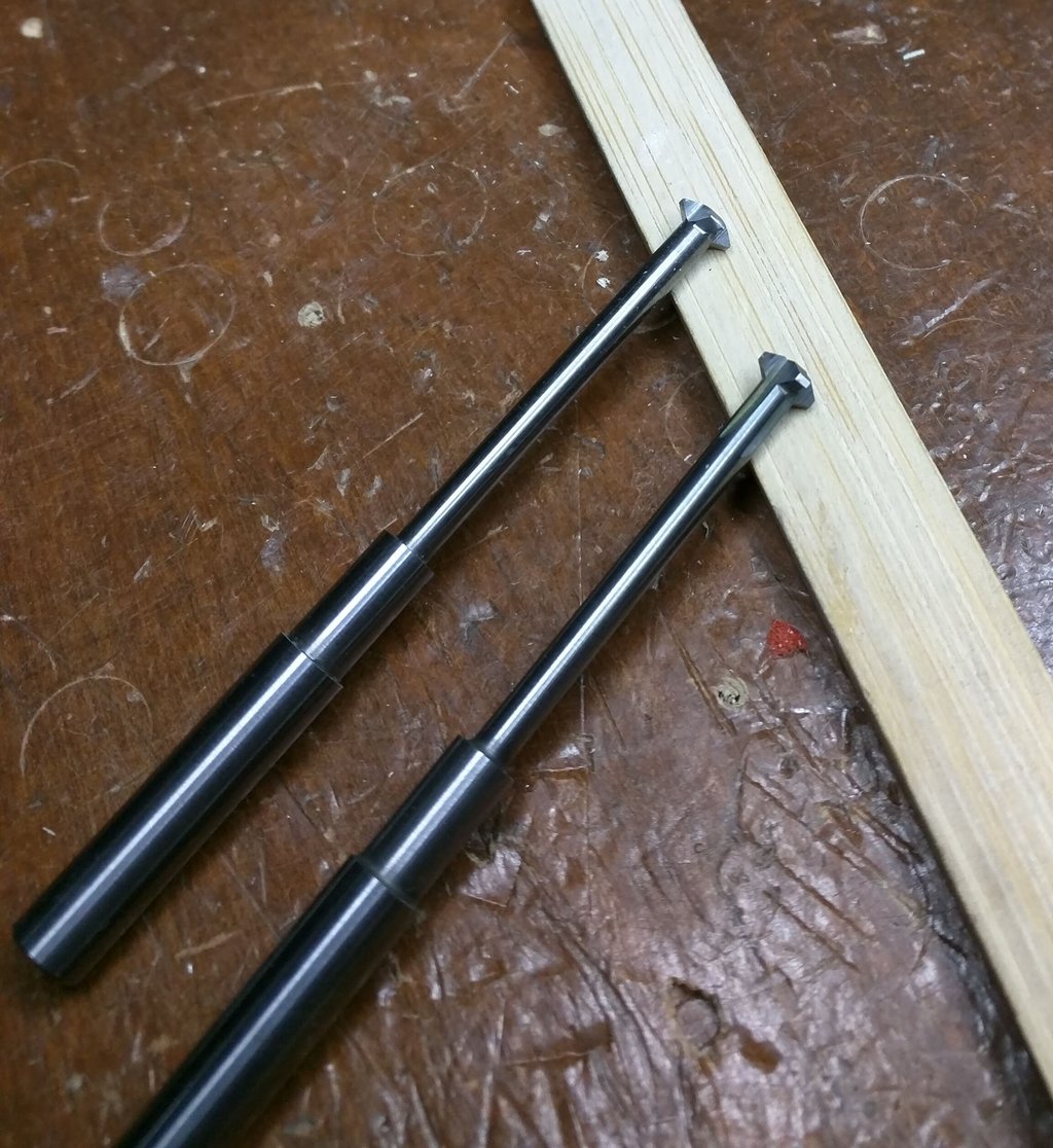 左が一般ネジ用、右が台形ネジ用の超硬スレッドミルです。いつも刃物を作ってもらっているところで特注しています。良い刃物を作ってくれます。