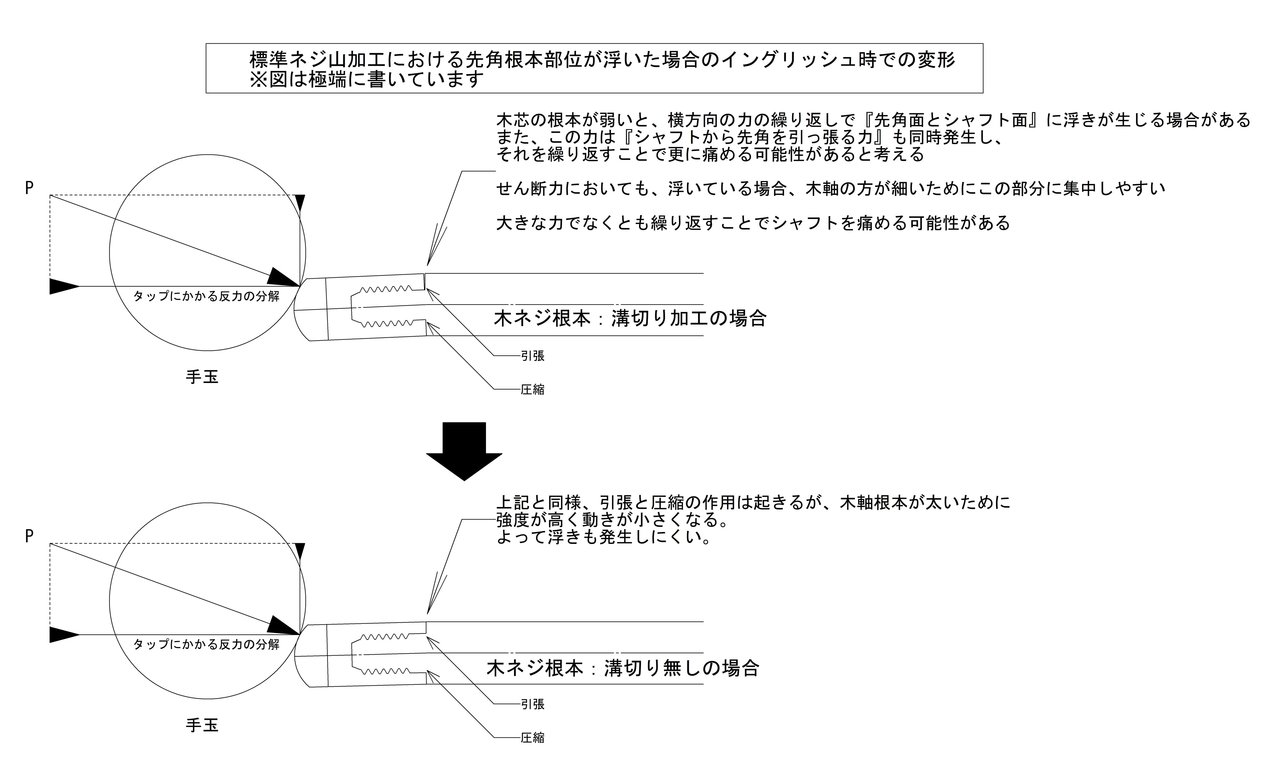 材料が木であるネジは、ネジ山の先端はほとんど力を受けられません。木なので簡単に欠けて取れます。また、そのネジ山が入るための先角素材も深くネジ切る必要があり、当然それだけ断面欠損が出ます。先角材の強度が確実に落ちます。木のネジ山は、根本以外はほとんど意味を成さないと考えます。