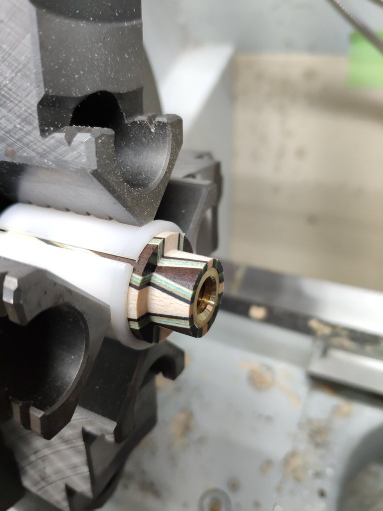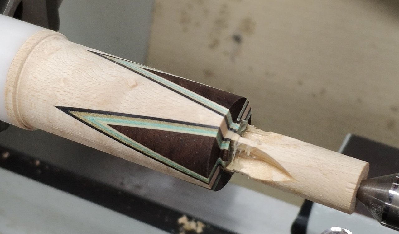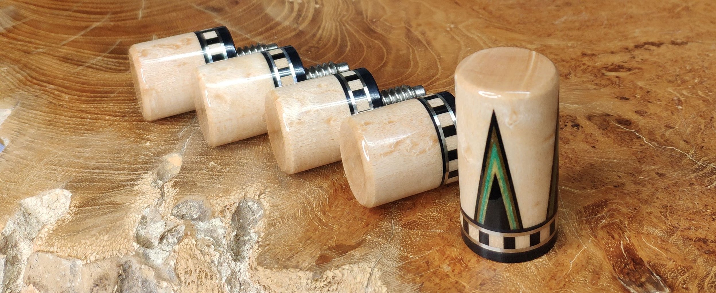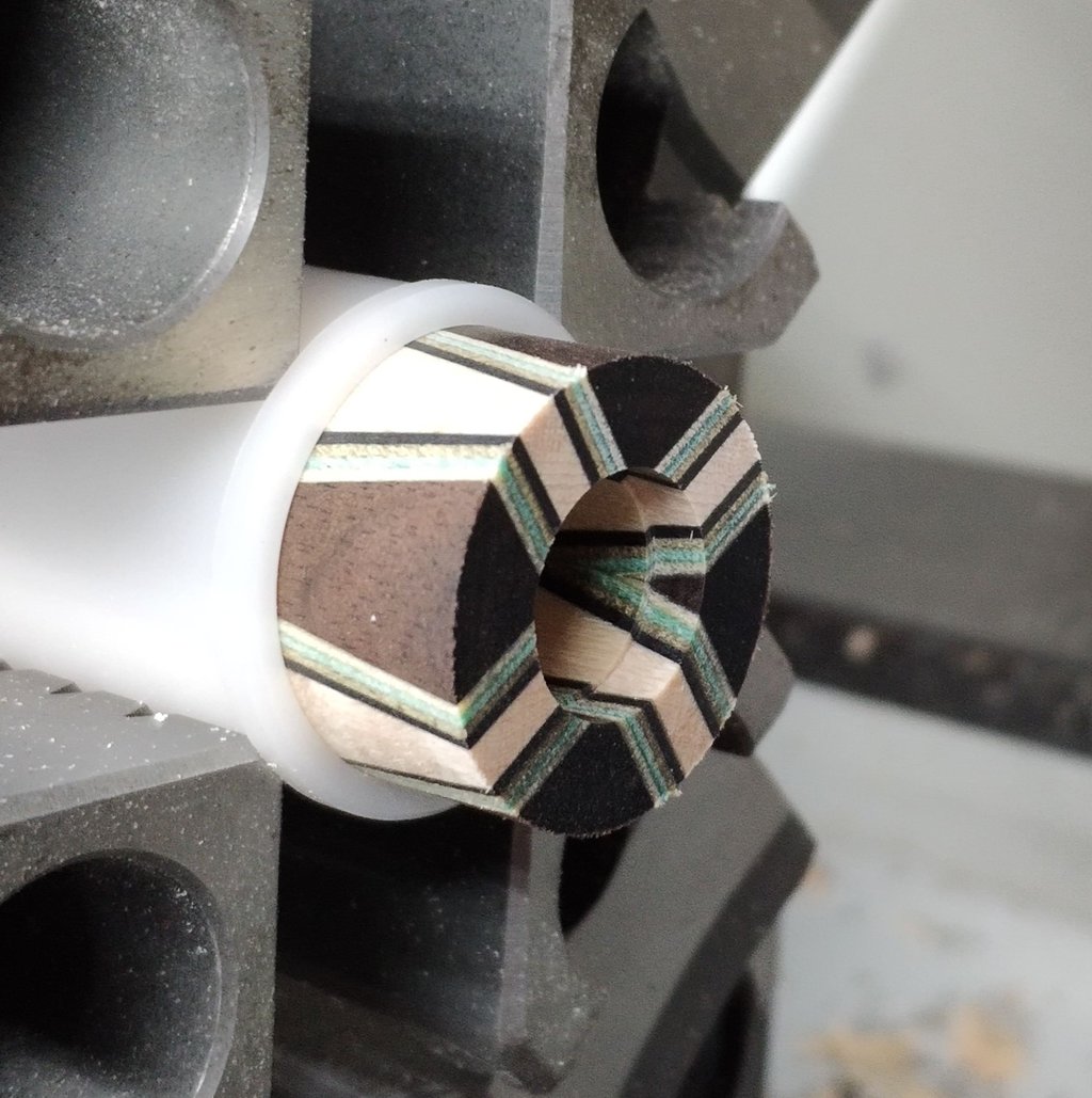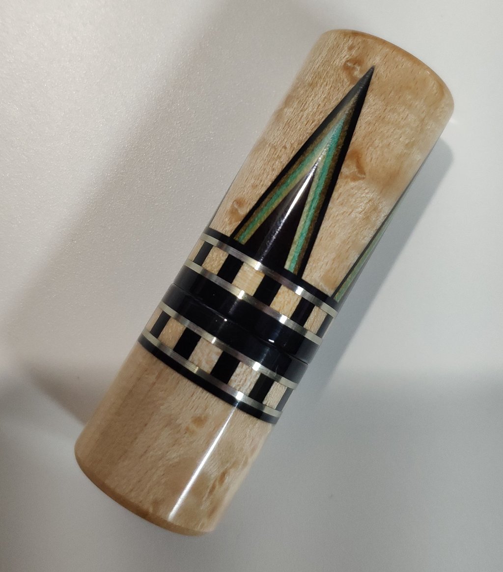 メイプルの0.6mm板を薄緑・茶・黒に染め分けて張り合わせて作っています。